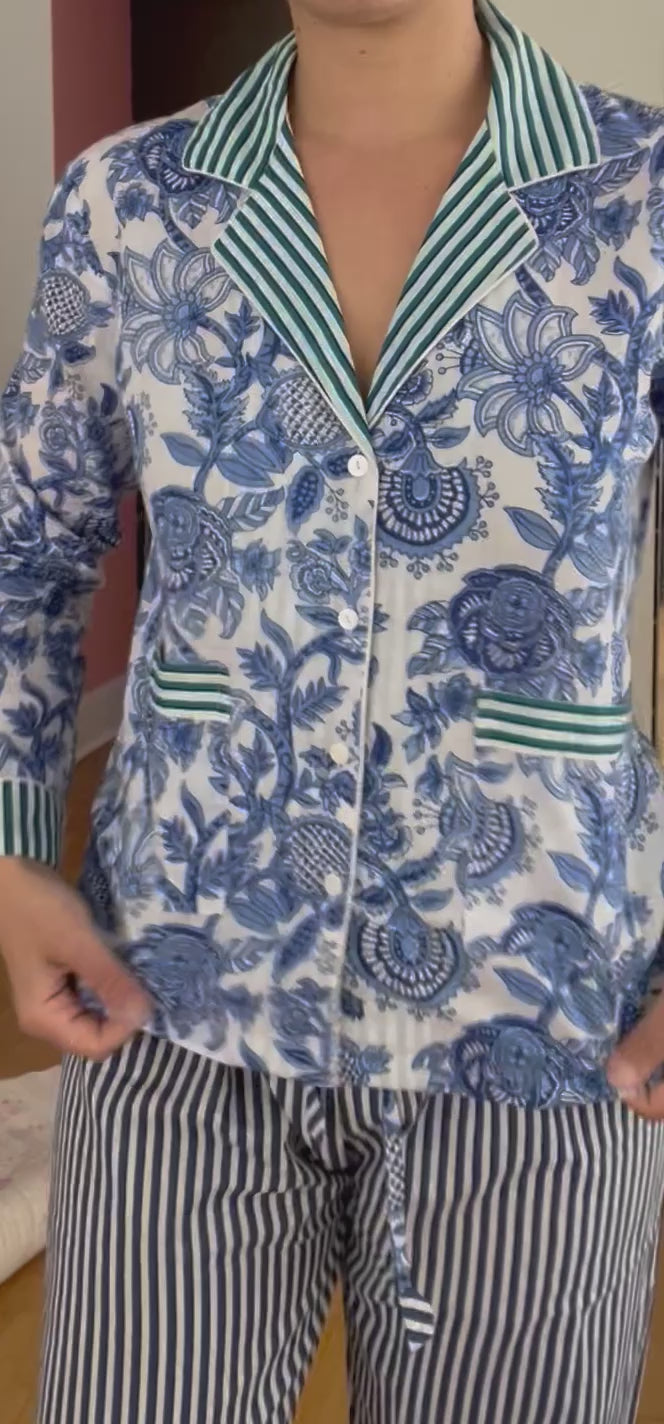 Our vibrant, 100% cotton pajamas are handcrafted using a traditional, and artisanal Indian technique. Each pattern and color is carefully selected and manually prepared, giving every piece its own unique character. With a slim fit and lightweight fabric, our pajamas are perfect for all seasons. This slim fit model is tailored and refined, designed in a European cut for a sleek silhouette. The shirt can also double as a casual daytime top, paired with jeans or dressier pants; the pants could also make a perfect choice for a casual day out or even a breezy beach stroll.