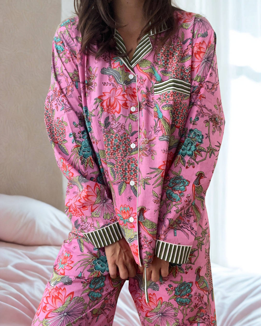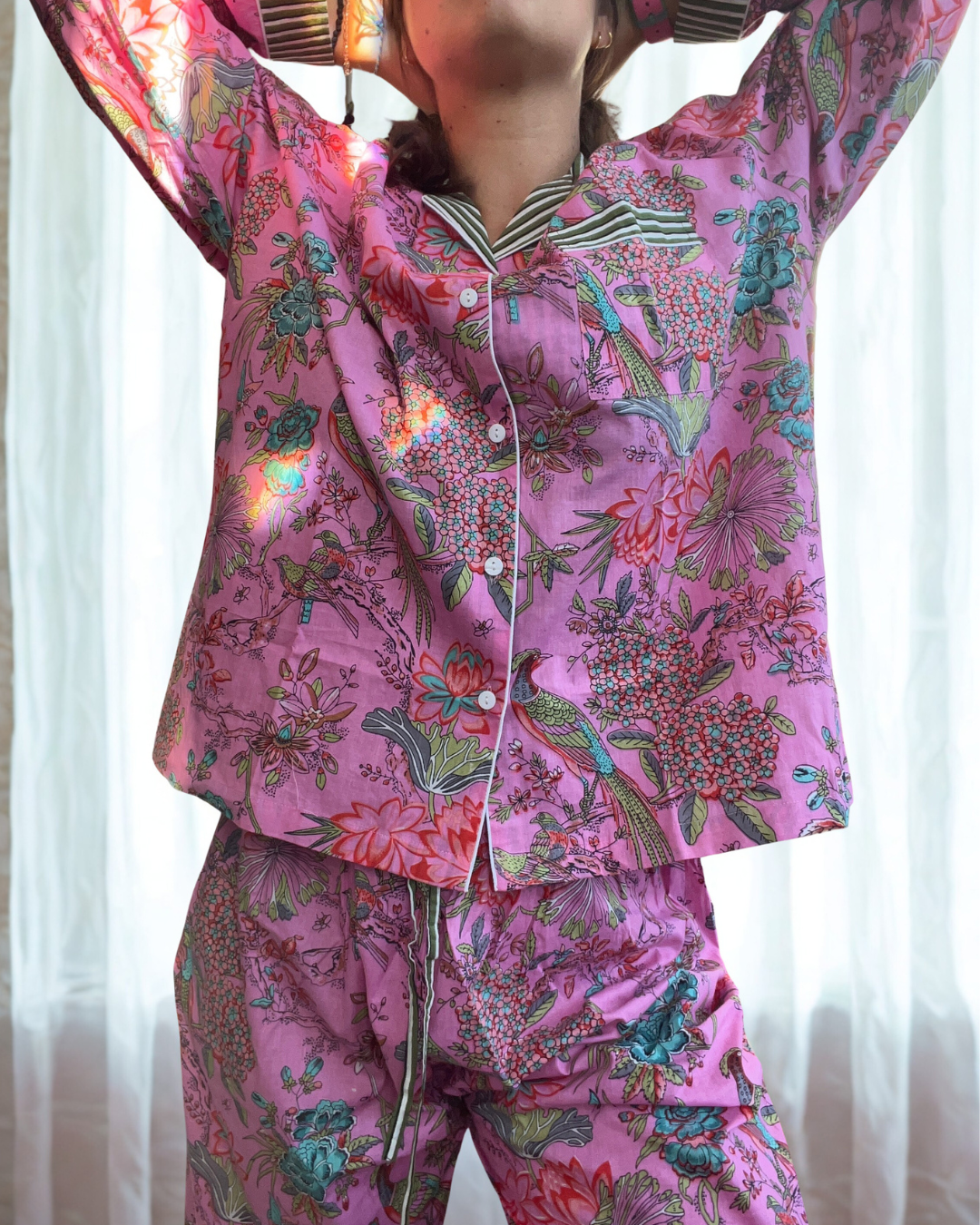 Our vibrant, 100% cotton pajamas are handcrafted using a traditional, and artisanal Indian technique. Each pattern and color is carefully selected and manually prepared, giving every piece its own unique character. With a loose fit and lightweight fabric, our pajamas are perfect for all seasons. The shirt can also double as a casual daytime top, paired with jeans or dressier pants.
