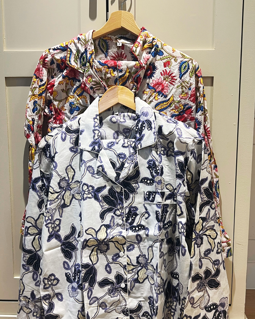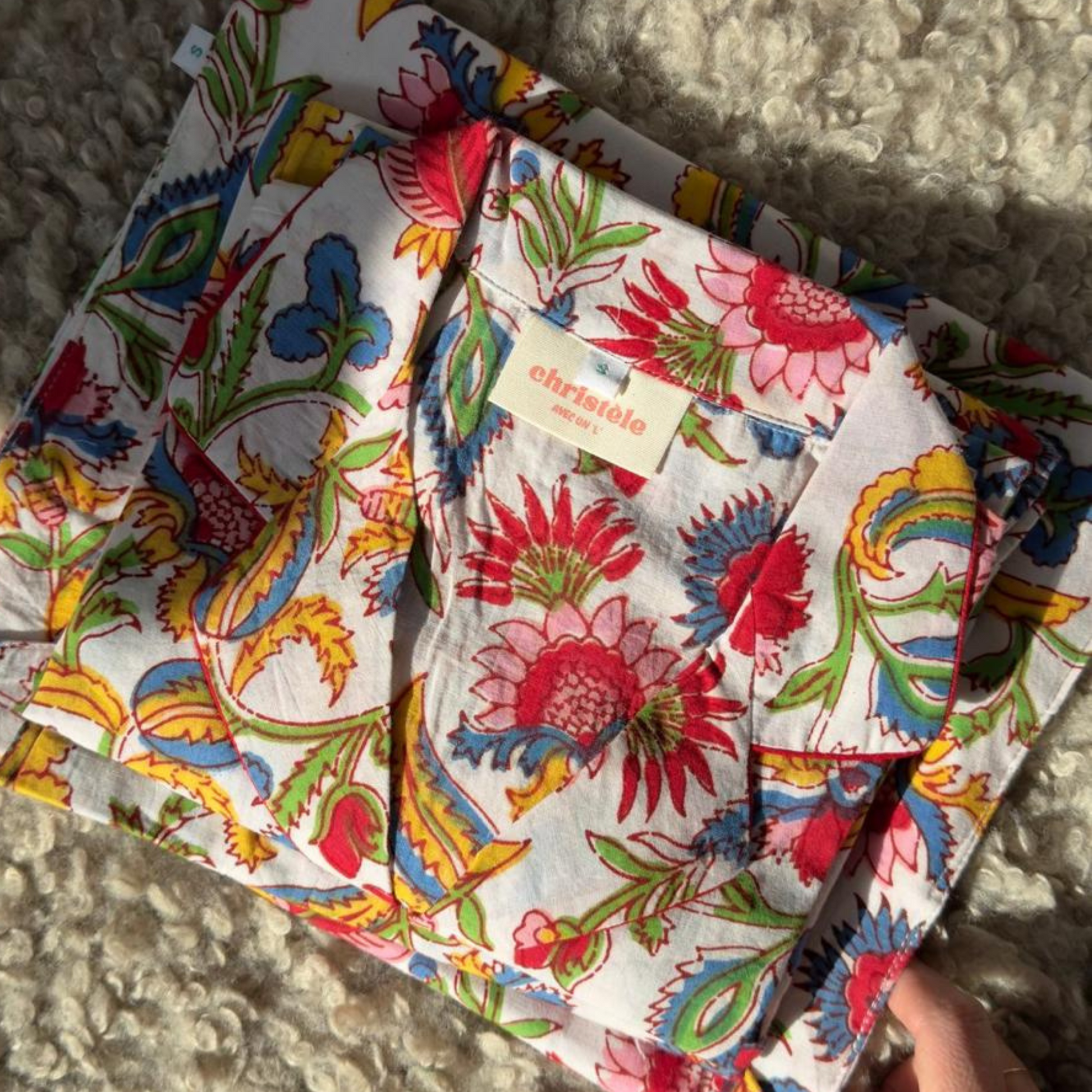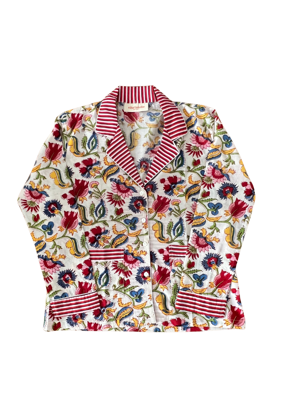 Our vibrant, 100% cotton pajamas are handcrafted using a traditional, and artisanal Indian technique. Each pattern and color is carefully selected and manually prepared, giving every piece its own unique character. This slim fit model is tailored and refined, designed in a European cut for a sleek silhouette. The shirt can also double as a casual daytime top, paired with jeans or dressier pants; the pants could also make a perfect choice for a casual day out or even a breezy beach stroll.