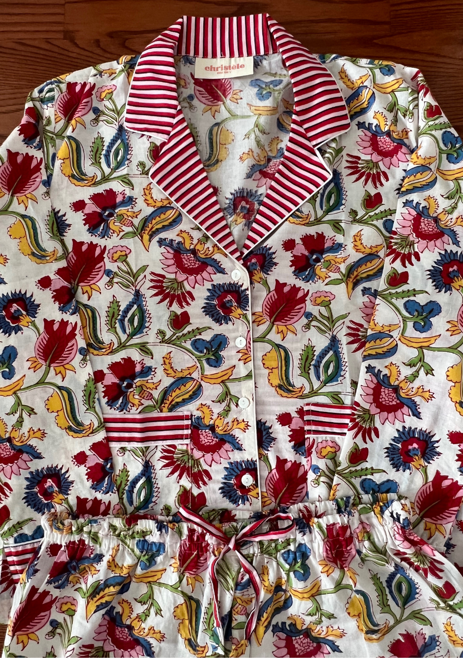 - Floral-pattern shirt top and bottom with striped accents