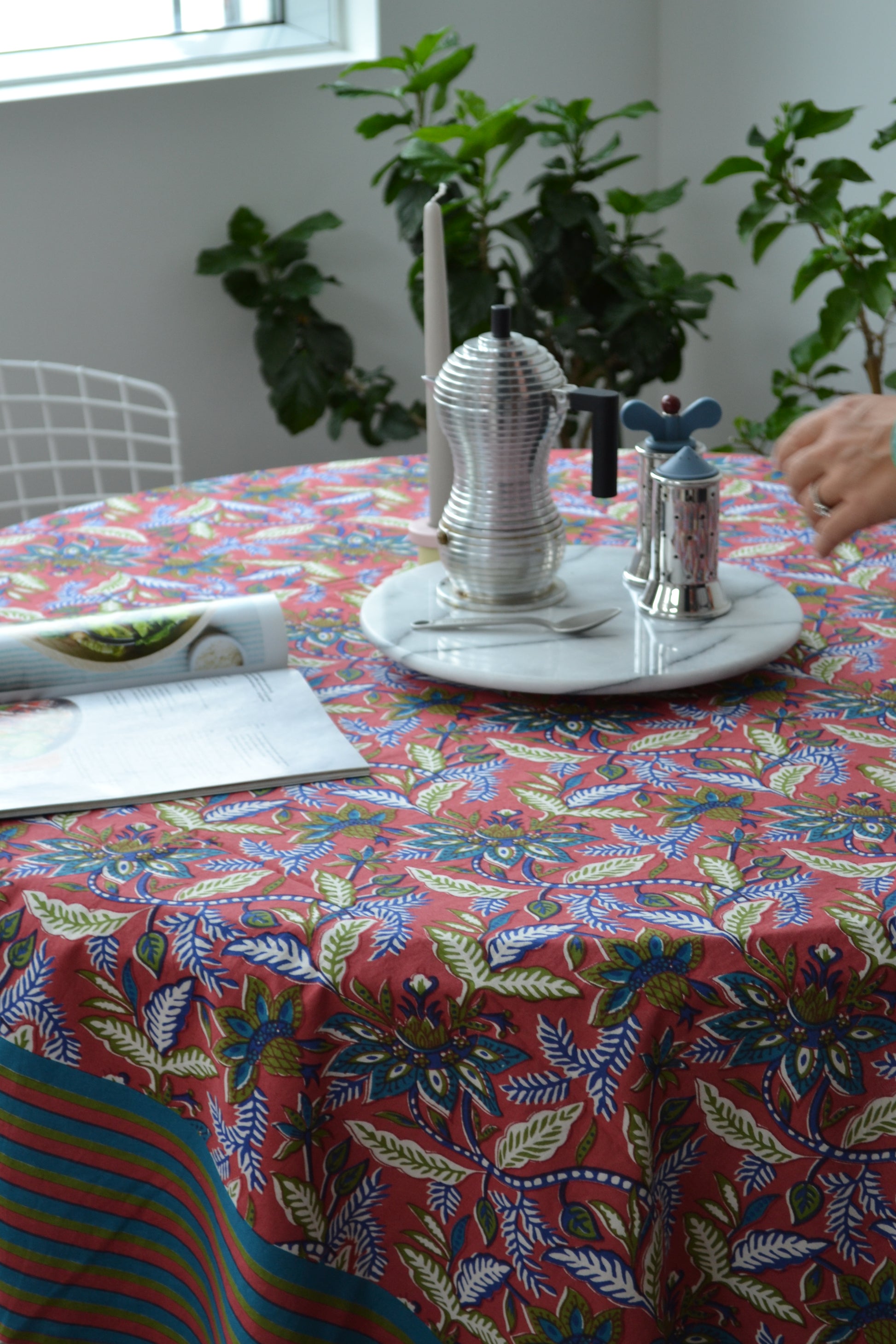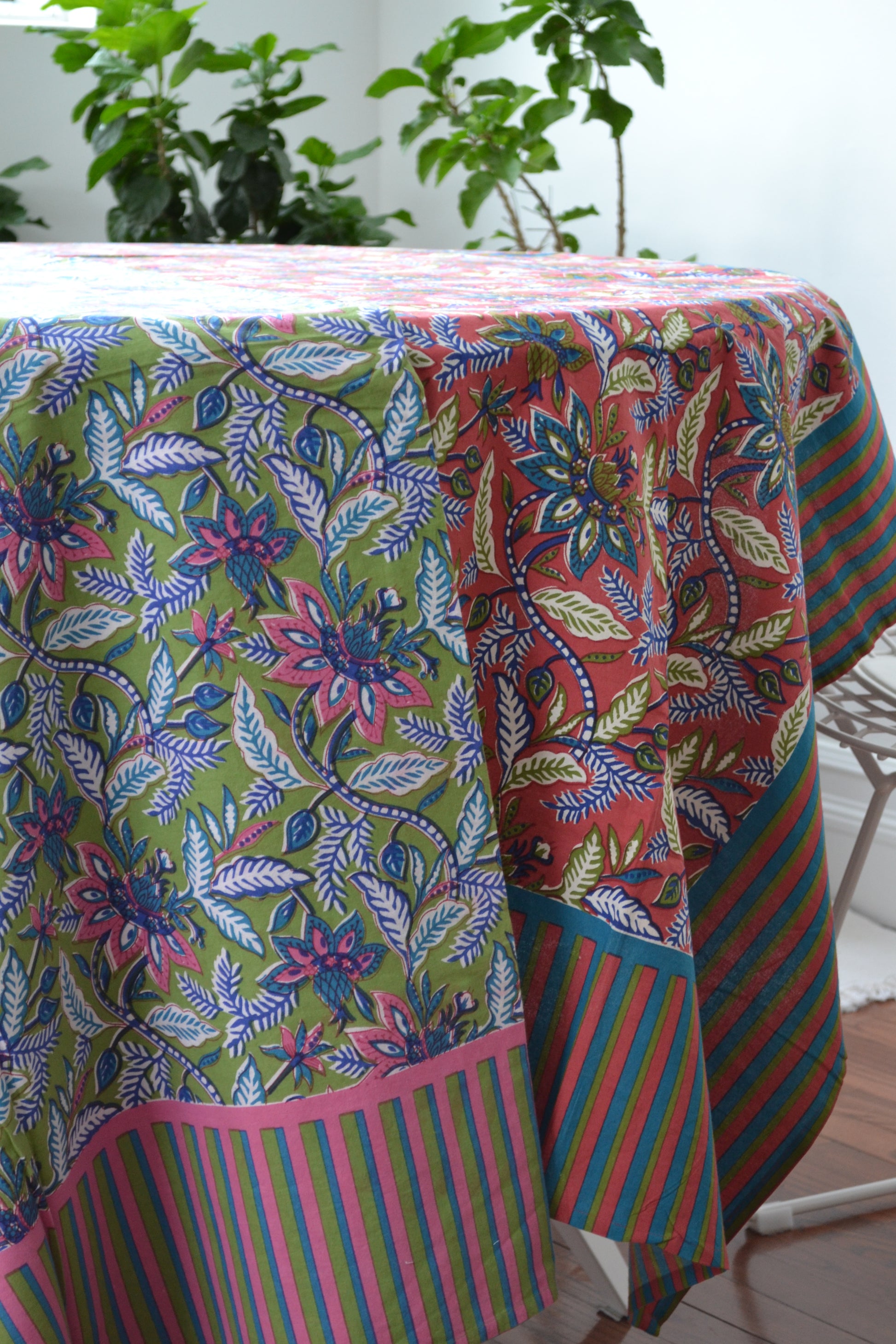 Add a touch of color and vitality to your table with these lovely 100% cotton tablecloths, printed and handmade using a traditional and artisanal Indian technique. Each pattern and color is carefully selected and manually prepared by artisans we collaborate with, giving each piece its own unique character. Small imperfections and color variations may appear, reflecting the artisanal work and adding to the authentic charm of tablecloth.